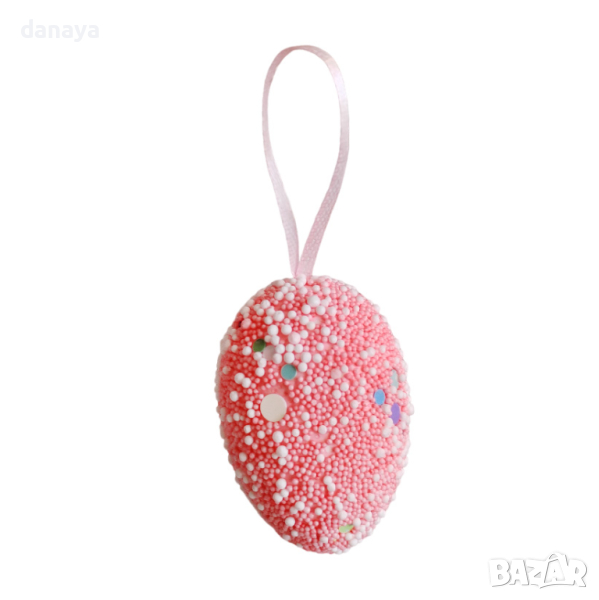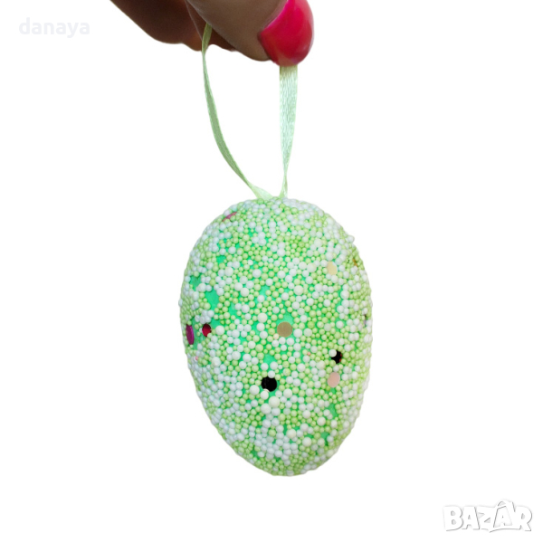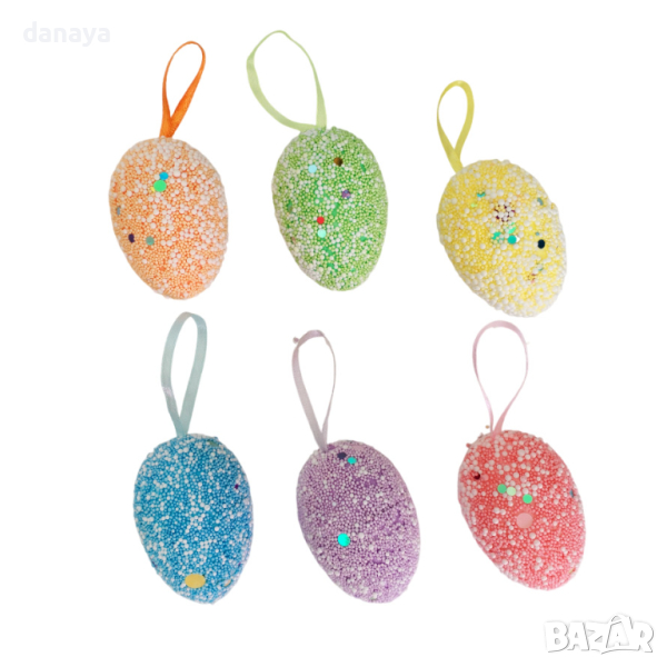 Декоративни шарени великденски яйца с връвка за окачване на цъфнало клонче, ваза с цветя, или на стена. Яйцата са обсипани с множество малки топчици и лъскави пайети. Чудесна декорация и украса за светлия празник Великден.
