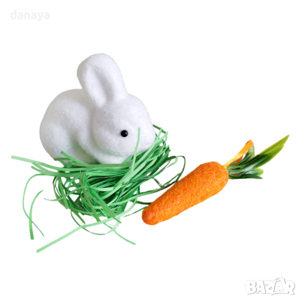 Украса за Великден – бяло зайче с морков и тревичка. Красиво допълнение към великденската украса. Поставете ги до панерът с великденски яйца или си направете кътче, което да носи пролетно настроение у дома.
