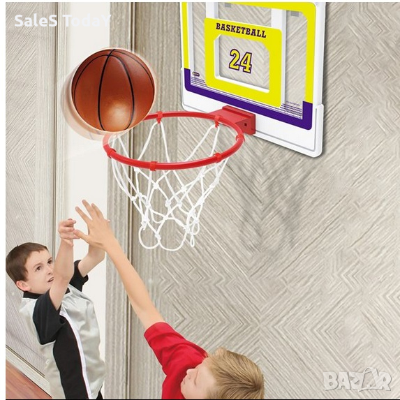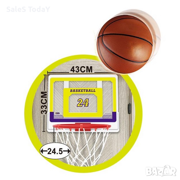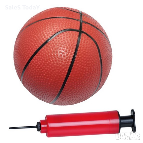 Баскетболна топка с пластмасово табло 43х33см и метален кош Ø24.5см, бяла мрежа и топка. Закрепва се лесно за вратата на стаята с метални кукички (широчина 4,5 см). Помпата също е включена. Подходящ е за вътрешна и външна употреба.