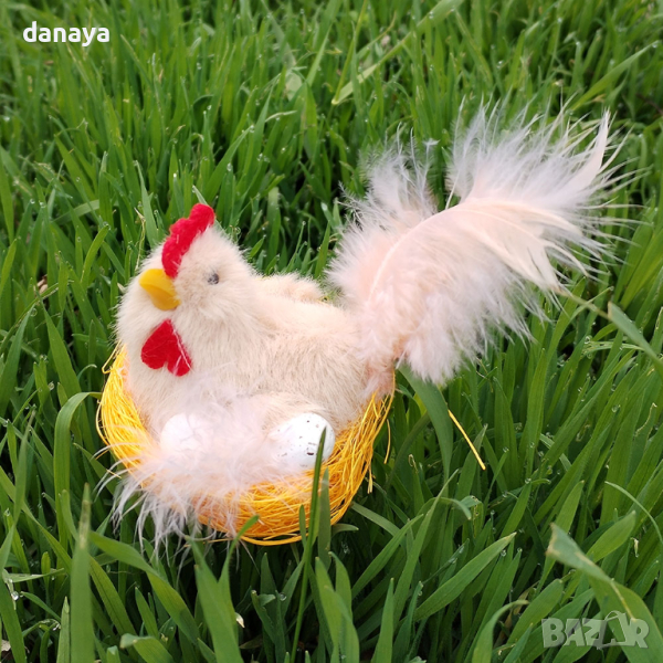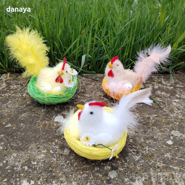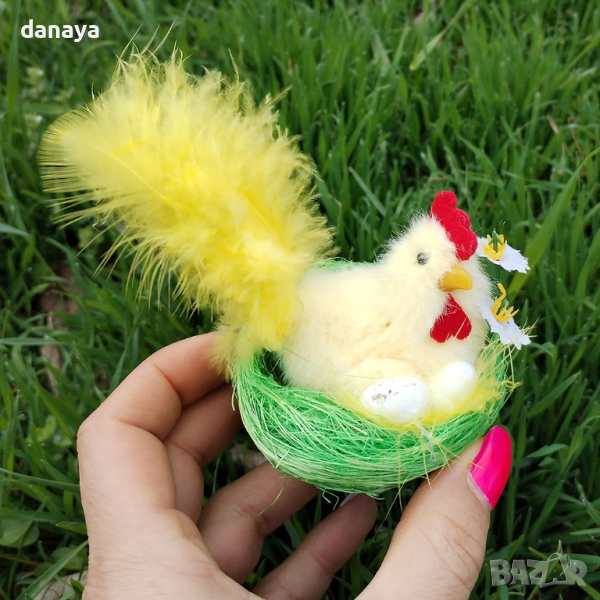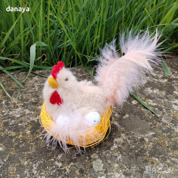 Малка великденска декорация пухкава кокошка с яйца в гнездо. Подходяща за украса и декорация към великденските яйца и великденската трапеза. Коккошките са изработени от плюшен материал с опашки от естествени пера, а гнездото от кокосова слама.