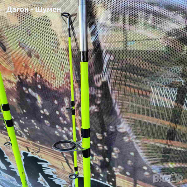 Невероятно мощна, надеждна и издръжлива въдица. Усилена въдица от плътен стъклопласт за трофейни риби, амур, сом, шаран, толстолоб и др. Състои се от 2 части, изработена от плътно фибростъкло със специален дизайн за далечни замятания. Снабдена с големи, подсилени водачи с три крачета и удобна дръжка от EVA материал, съчетана с практичен макародържач. Основният водач е с диаметър 4 см. Въдицата е с допълнително подсилена сглобка чрез шведски винт.