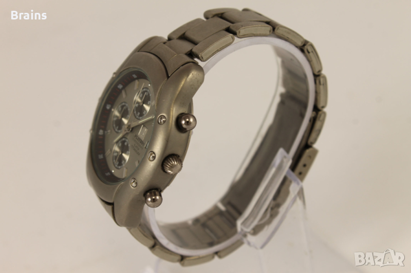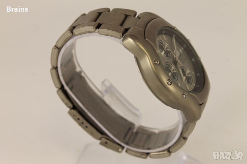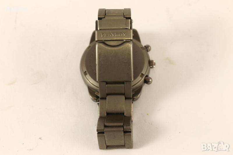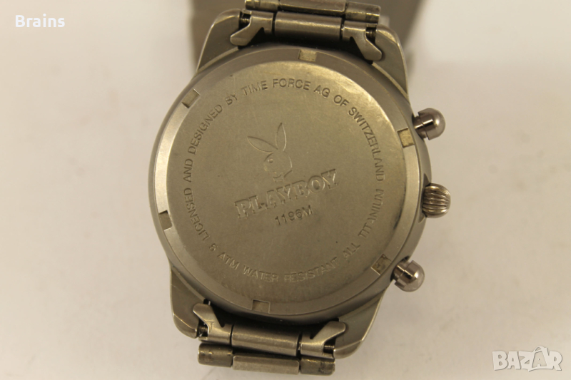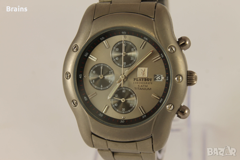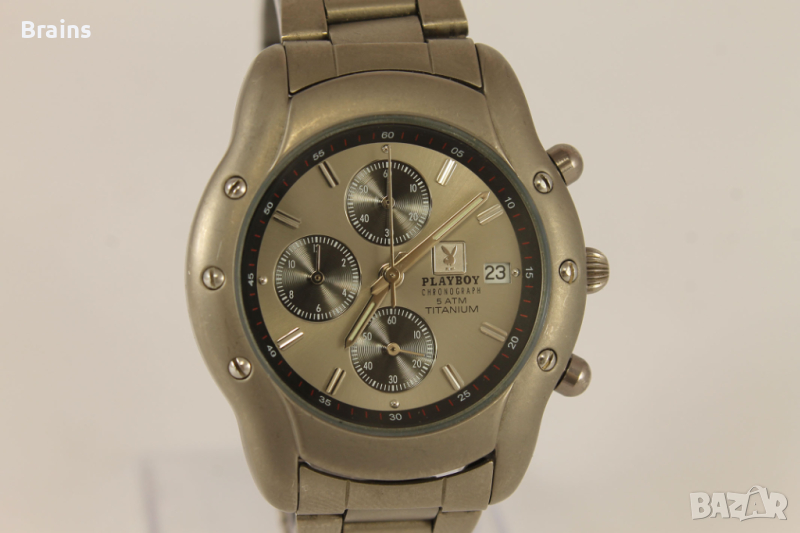 Оригинален Швейцарски дамски часовник кварцов хронограф PLAYBOY. Изцяло изработен от титаний. Циферблата и стрелките са в перфектно състояние. Стъкло без драскотини. Минимални драскотини по кайшката и корпуса. Всички функции работят, работи точно.