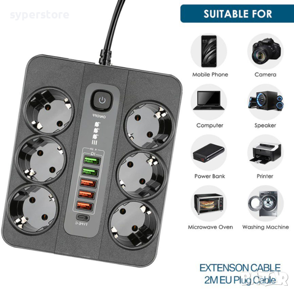 Разклонител за контакт 220V ,6 гнезда, 5 USB, TypeC Digital One SP00931 bkl-11EU, със защита, 3USB порта + 2xUSBFastCharge +TypeC PD20W, 2м, 3000W, 10А