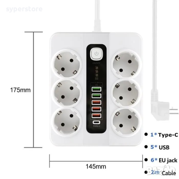 Разклонител за контакт 220V ,6 гнезда, 5 USB, TypeC Digital One SP00931 bkl-11EU, със защита, 3USB