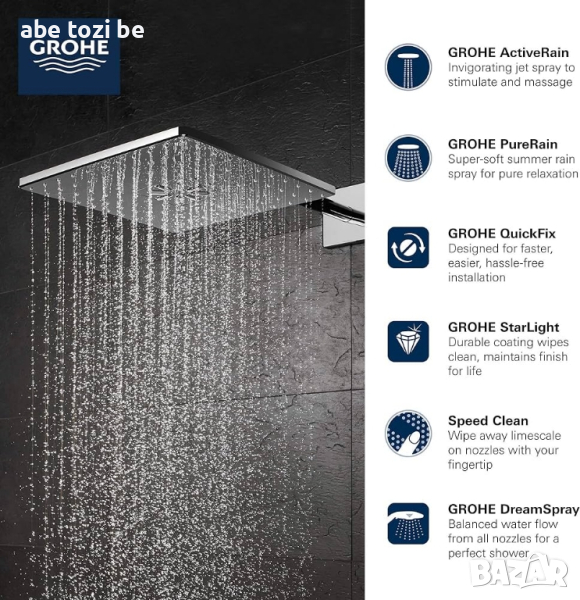 Душ пита RAINSHOWER 310; Размер: 310мм; GROHE DraemSpray перфектана струя; GROHE StarLight хромирано покритие; SpeedClean система за бързо почистване; GropStop дебитен ограничител 9,5л/мин. Цената в магазина е около 800лв подарък ми е но така и не я монтирах и ми трябват пари