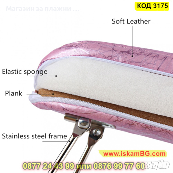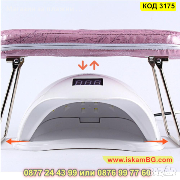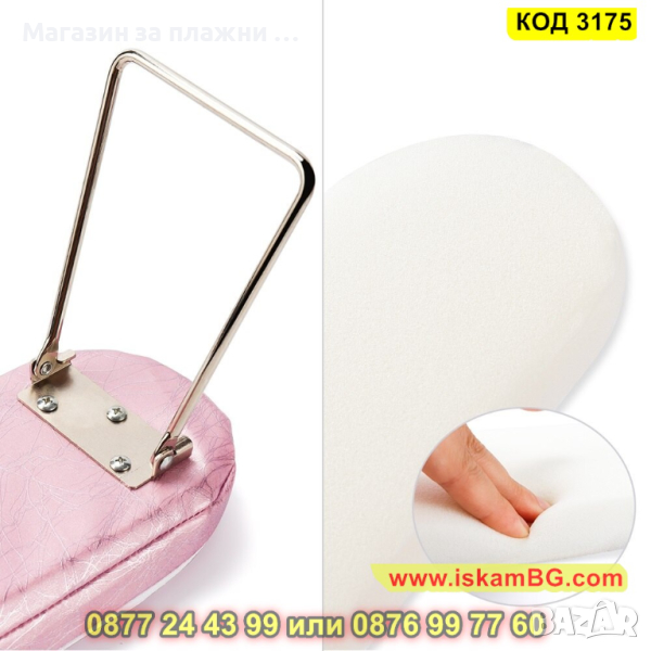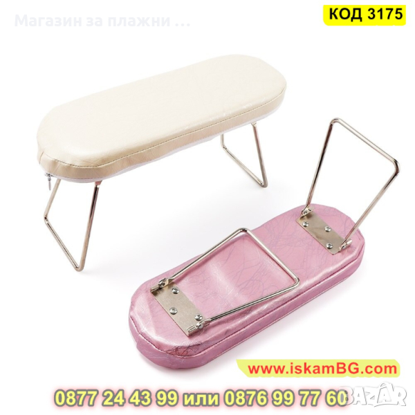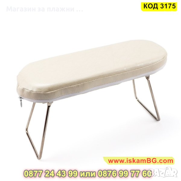 Възглавничка поддържаща ръцете по време на маникюр с подвижни крачета. Тапицерията е изработена от еко кожа, а краката са изработени от хромирана стомана. Височината на масичката е подходяща за поставяне на UV лампа или прахоуловител под нея.