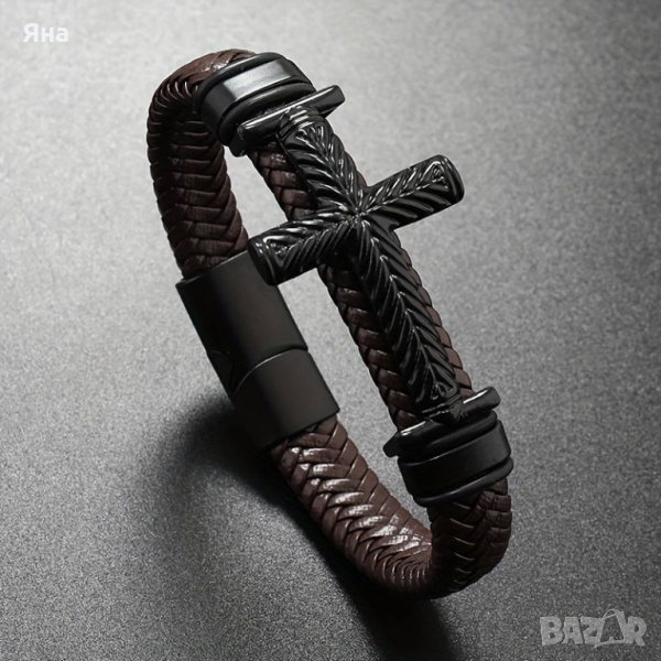 Черна плетена кожена гривна с кръст. → Обява 44844278