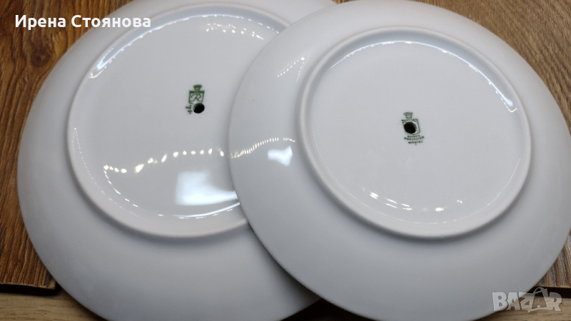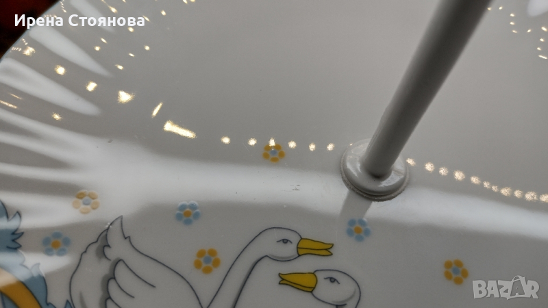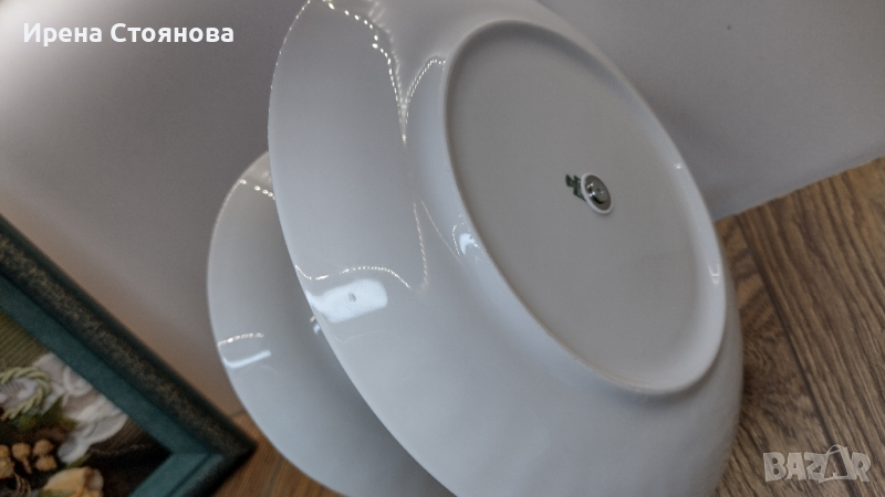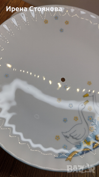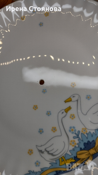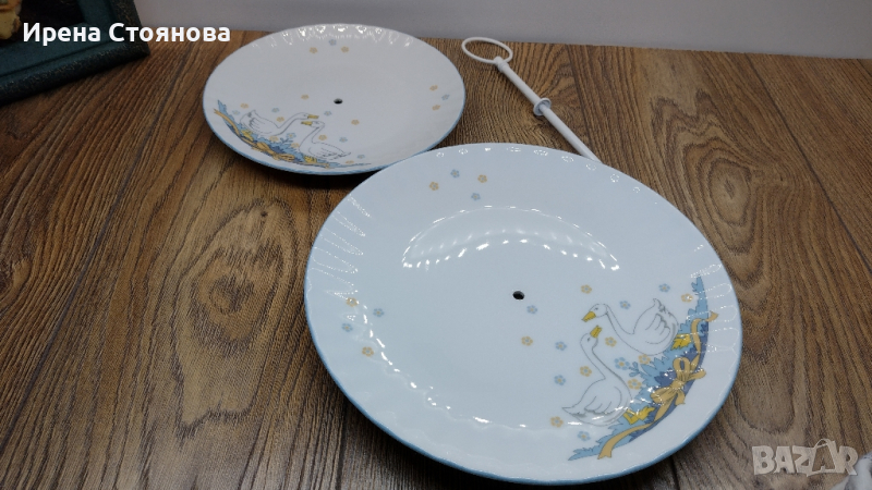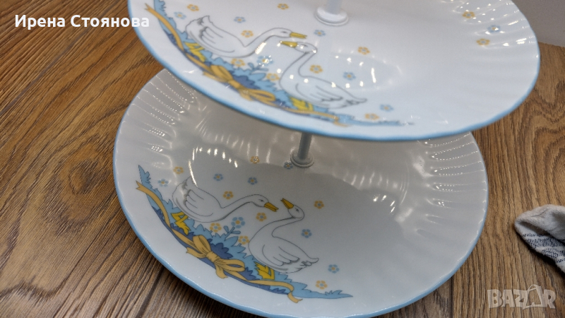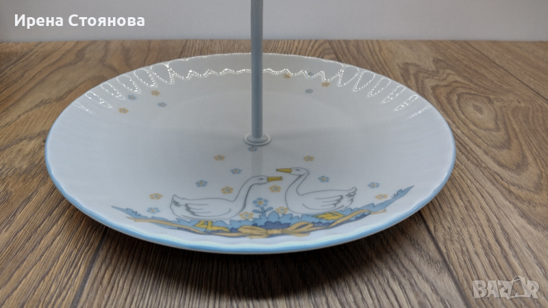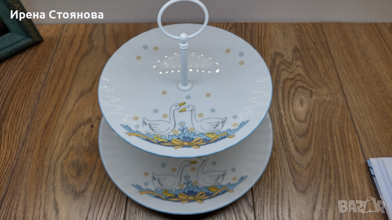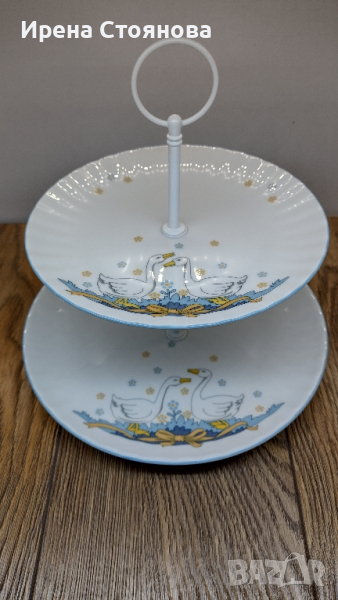 Поднос за сервиране на сладки с две нива. Чинии с декор гъски Wunsiedel Bavaria, производство след 1970 г. Диаметър голяма чиния 23,7 см, малка 18,8 см. Обща височина с дръжка 24 см. Минимални, почти незабележими следи от употреба при чиниите, под ъгъл и светлина. При голямата има малка пукнатина( само при гланца отгоре) при отвора, остава под държач и не се забелязва и пречи за употреба. Цена 45 лв.