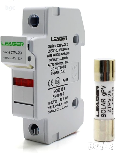 Разединители за Фотоволтаична система 10x38 gPV 1000V DC с бушон за DIN шина - 24 месеца гаранция