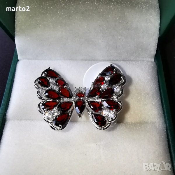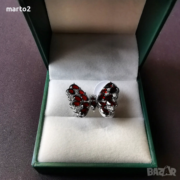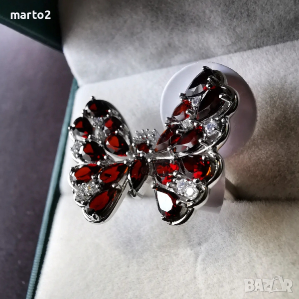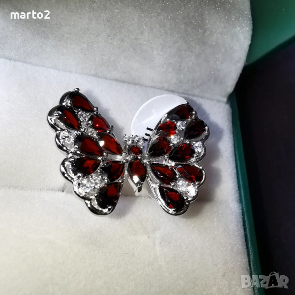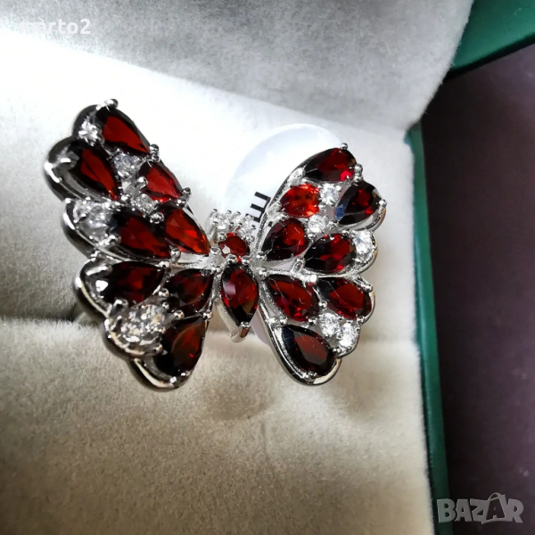 Елегантен сребърен 925 пръстен "Пеперуда" с родиево покритие и Натурални Гранати и Циркони! → Обява 44848133