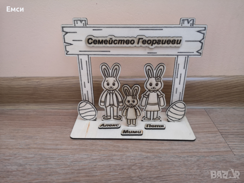 2. Семейство зайчета с гравирани имена и надпис по желание от дърво- 18 лв за 4 зайчета и 16 лв за 3 зайчета.