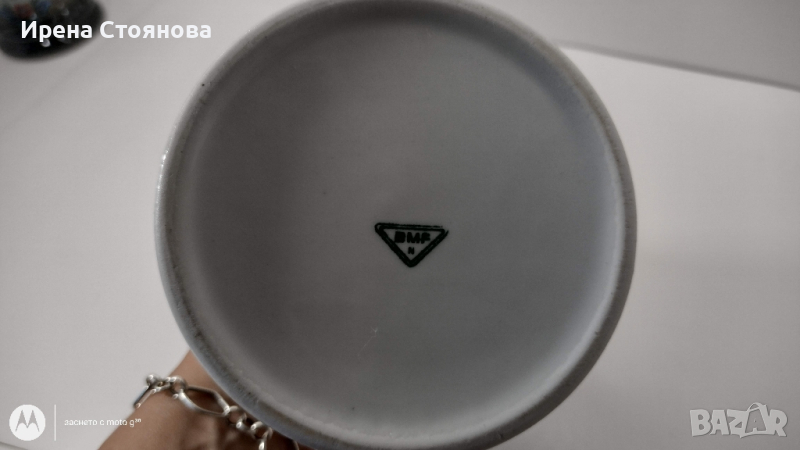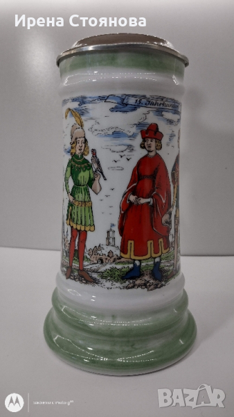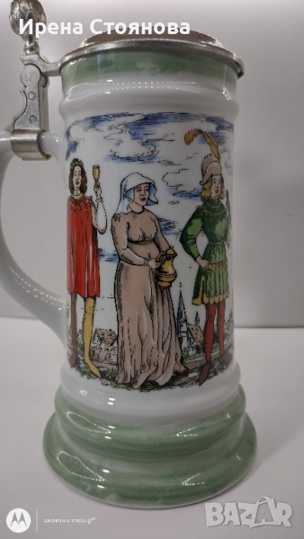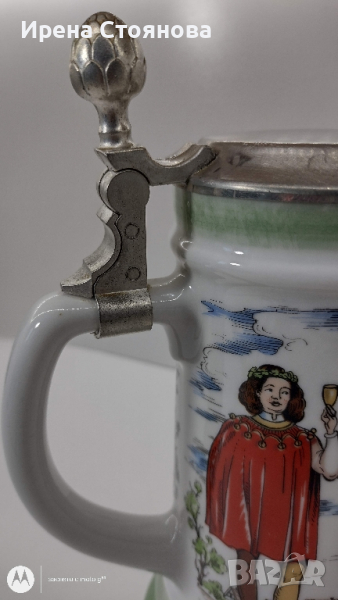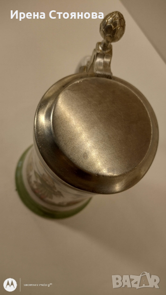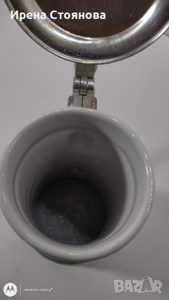 Халба за бира BMF Rein-Zinn W. Germany. Маркировка използвана в периода 1949-1990 година. Вместимост 800 мл до ръба, висока част капак 23 см, без 20 см, диаметър на основата 11,5 см, на отвора 8,2 см. Леко изкривяване на капака. Цена 40 лв.