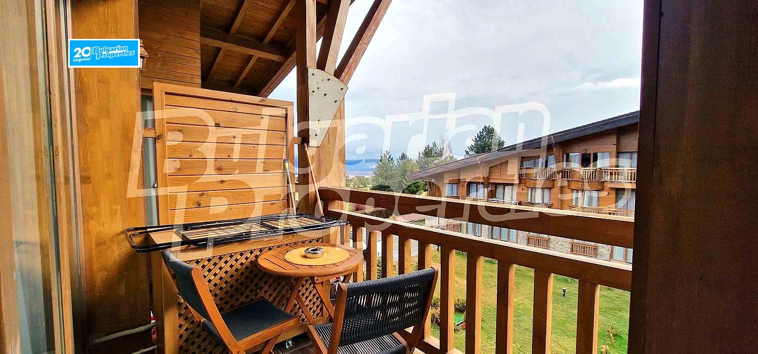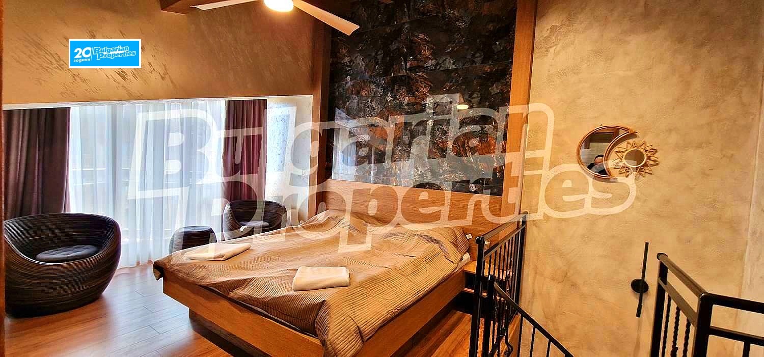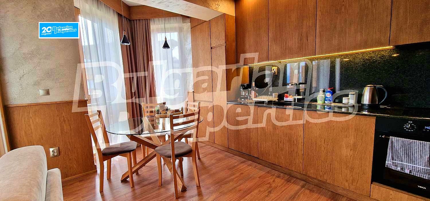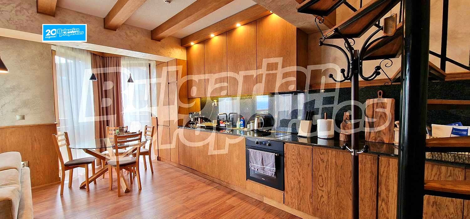 Просторното светло жилище (обща площ - 104.77 кв.м., общи части - 33.61 кв.м.) се състои от кухня с хол в едно помещение, спалня и баня с тоалетна на второ ниво и по един балкон на всяко ниво. Намира се на втори етаж в сградата, която е снабдена с асансьор. Разкрива прекрасна гледка към вътрешния двор с басейн и частично към планината. Пълното обзавеждане и оборудване може да разгледате на снимките. Апартаментът е чисто нов. Може да се отдава под наем както през комплекса, така и самостоятелно.
