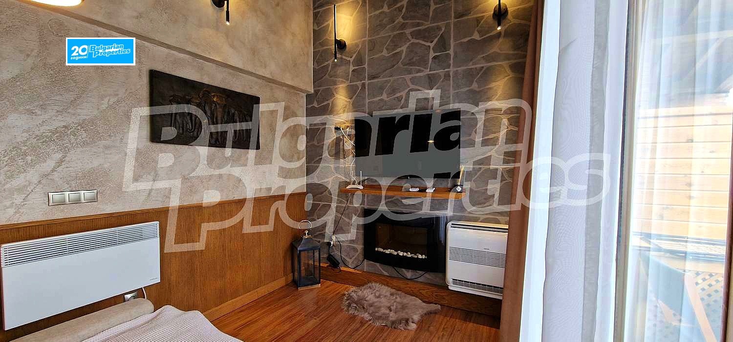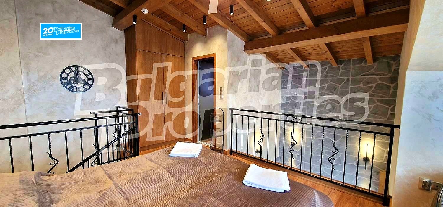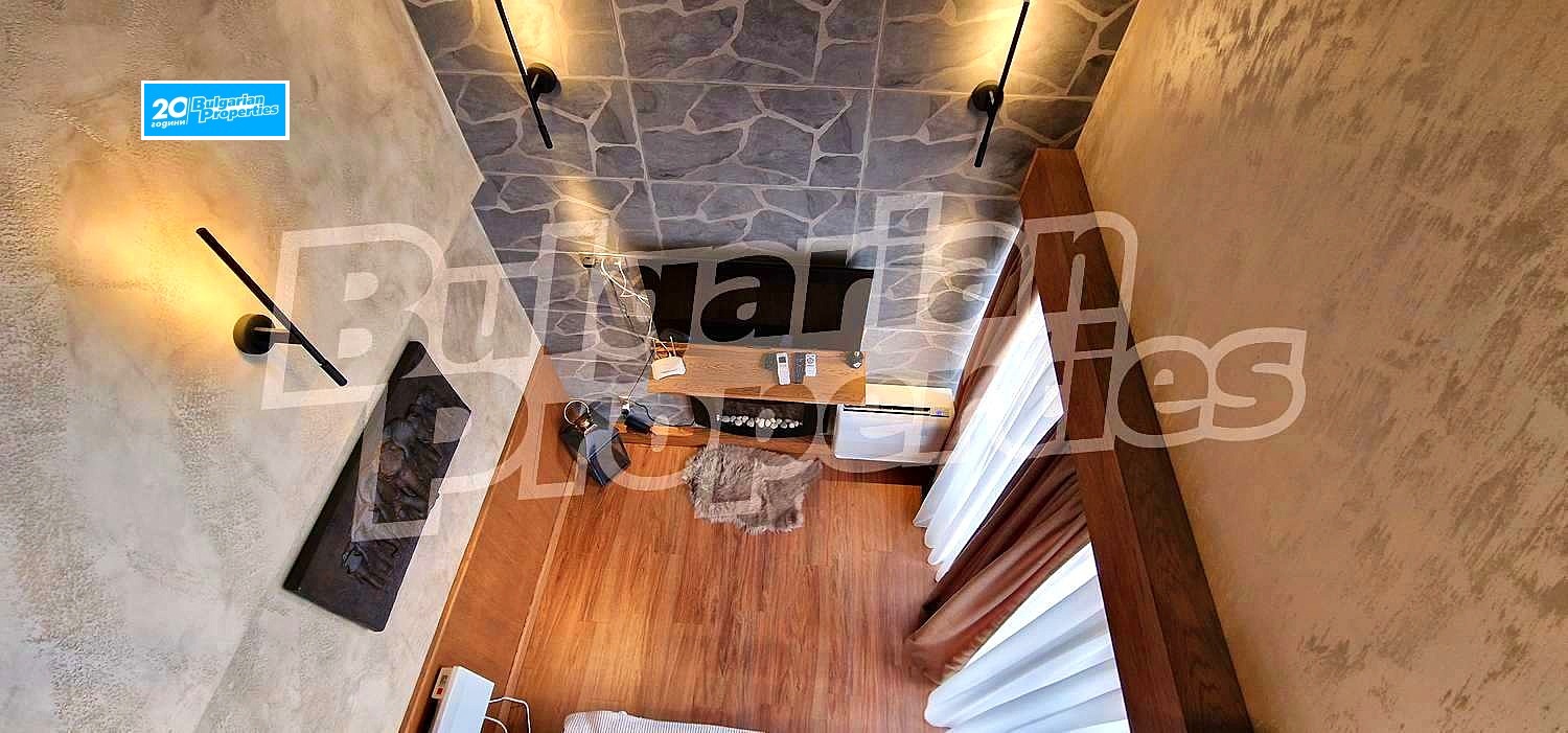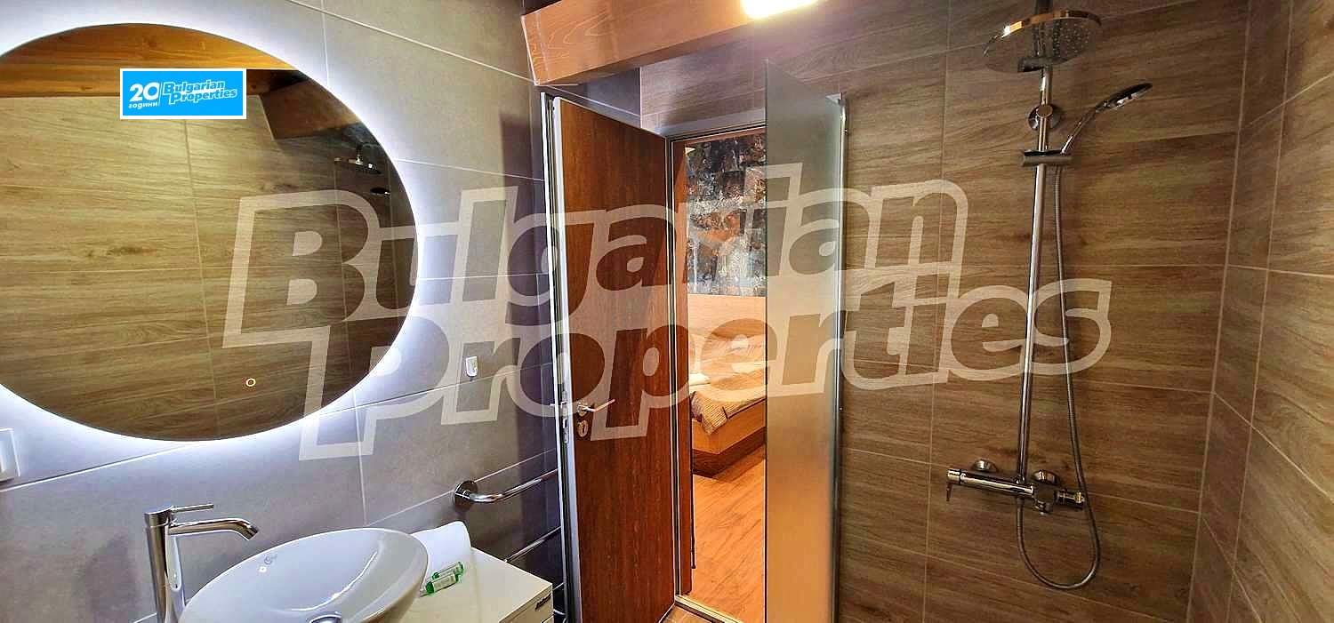 Просторното светло жилище (обща площ - 104.77 кв.м., общи части - 33.61 кв.м.) се състои от кухня с хол в едно помещение, спалня и баня с тоалетна на второ ниво и по един балкон на всяко ниво. Намира се на втори етаж в сградата, която е снабдена с асансьор. Разкрива прекрасна гледка към вътрешния двор с басейн и частично към планината. Пълното обзавеждане и оборудване може да разгледате на снимките. Апартаментът е чисто нов. Може да се отдава под наем както през комплекса, така и самостоятелно.