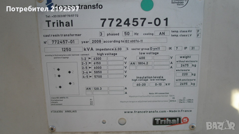 Trihal (производство на Schneider Electric) 1250 kVa, 6 kV.
