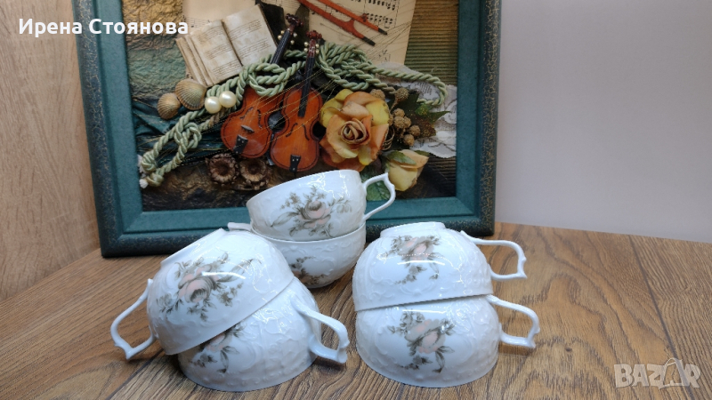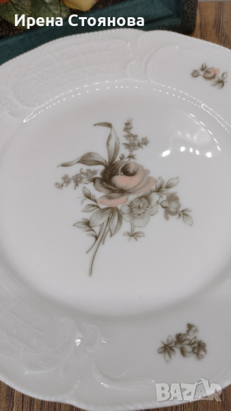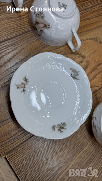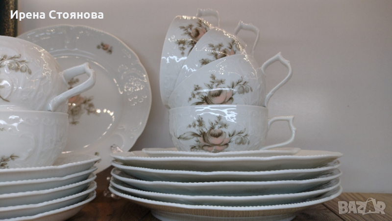 🤎🤎🤎Снежно бял, прозрачен порцелан, кафеви листенца и бледо розови рози, детайлен и изпъкнал релеф. Сервиза е в отлично състояние за годините си. Като забележка отчитам потъмняване отвътре на чайника при цедка на чучура и при някои чинии, почти незабележими на места следи от стоене една в друга, трудно забележими под определен ъгъл.