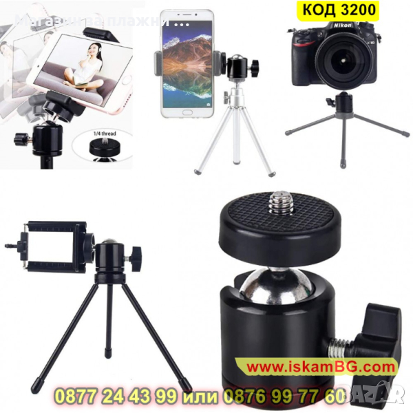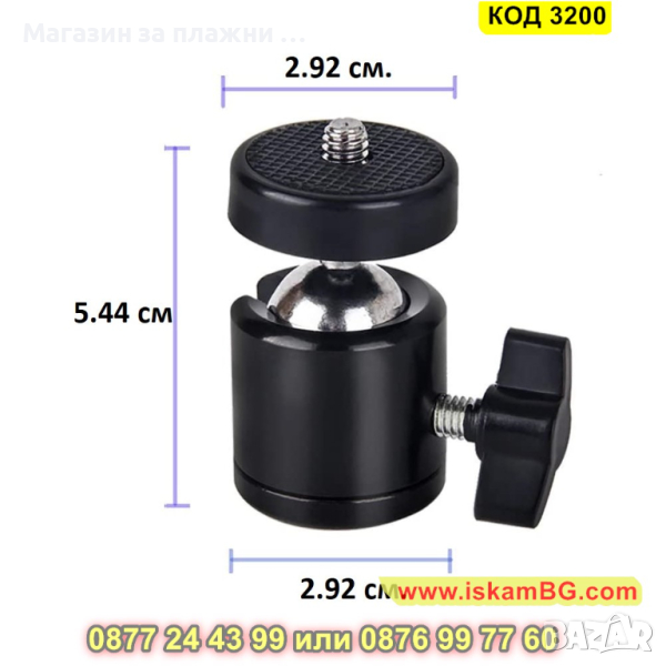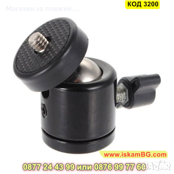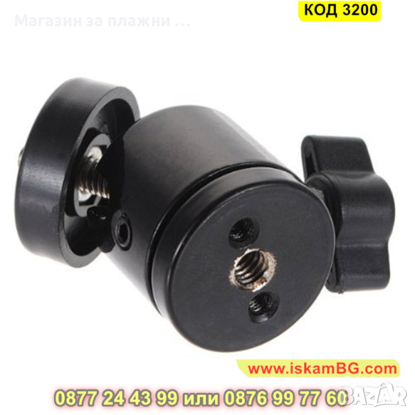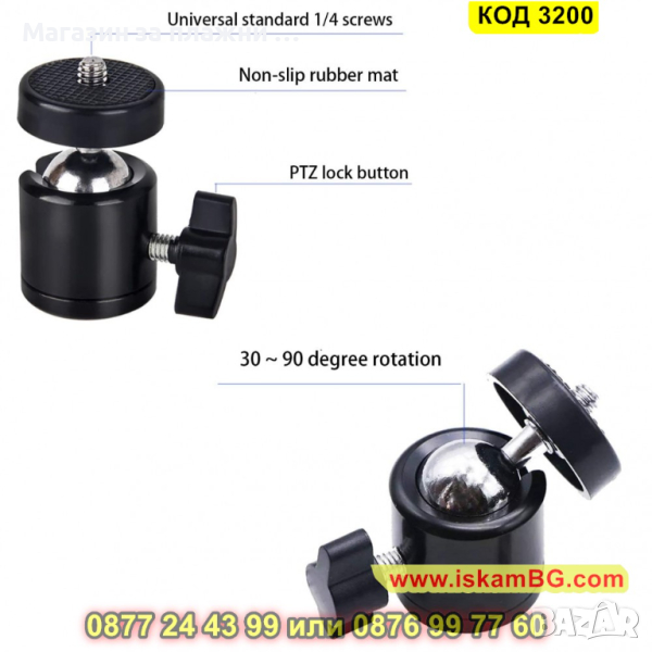 Универсална 1/4 инча външна резба и 1/4 инча отвор за вътрешна резба. Адаптер въртящ се на 360 градуса със сферична глава, настройка на ъгъла от 30 до 90 градуса. Подходящ за ползване за камери, светкавици, триподи и друго оборудване.