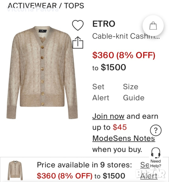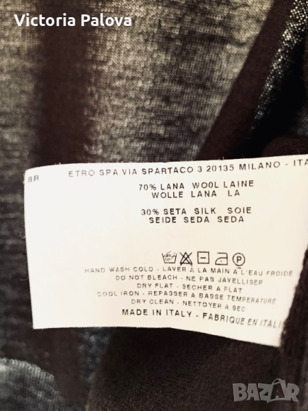 Изисканата елегантност е ДНК на модната къща ETRO, максимален комфорт и мекота. Всеки продукт на ETRO е истинско произведение на изкуството,страст към висококачествена мода и стил. Рамо -50-52см, ГО - 55-56см, дължина - 71см, ръкав - 67см. Брандирани копчета, много тънка вълна меринос 70% и коприна 30%.