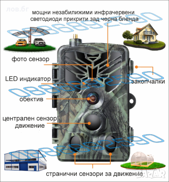 Тази камера е широко използвана за следене на животни в дивата природа , наблюдаване на вашия ловен периметър ,хранилки ,горски маршрути и пътеки използвани от преминаващ дивеч , хора или друг тип единици .Камерата може да се използва ,като подходящ вариант за охрана на ловни стопанства, къщи ,сгради ,отдалечени имоти ,пчелини ,ферми, техника на полето, овощни-зеленчукови градини и много други обекти по ваш избор.