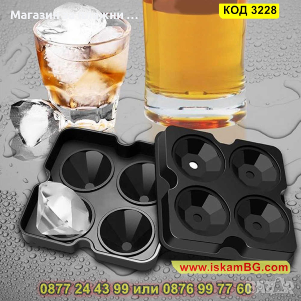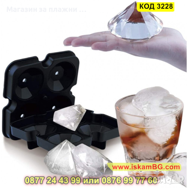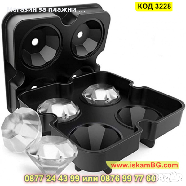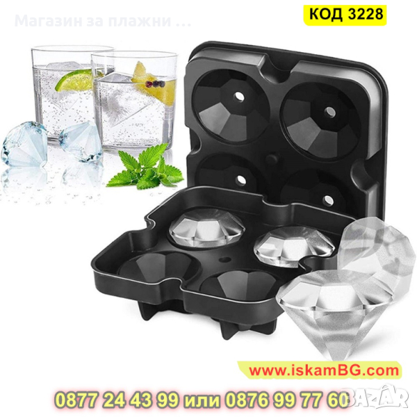 Ефектна форма за лед, от която се получават шест замръзнали диаманта наведнъж. Форма за ледени диаманти с четири места за наливане на вода. Може да се използва за замразяване на шоколад, желатин и цветни течности – ако сте прецизни и обичате експериментите, налейте различен цвят течност във всяка вдлъбнатина на формата и ще получите 4 разноцветни диаманта.