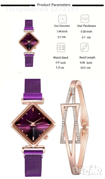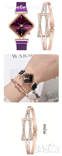 Квадратен дамски моден кварцов часовник+гривна