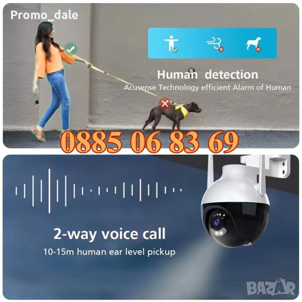 Камерата изпраща нотификации при засичане на движение и звук, директно на смартфона, чрез приложението, с което работи. PTZ управление: 355-градусово хоризонтално завъртане и 90-градусово вертикално, като по този начин обхваща по-голям периметър. Отлично качество на картината с реални 6MPX бленда.