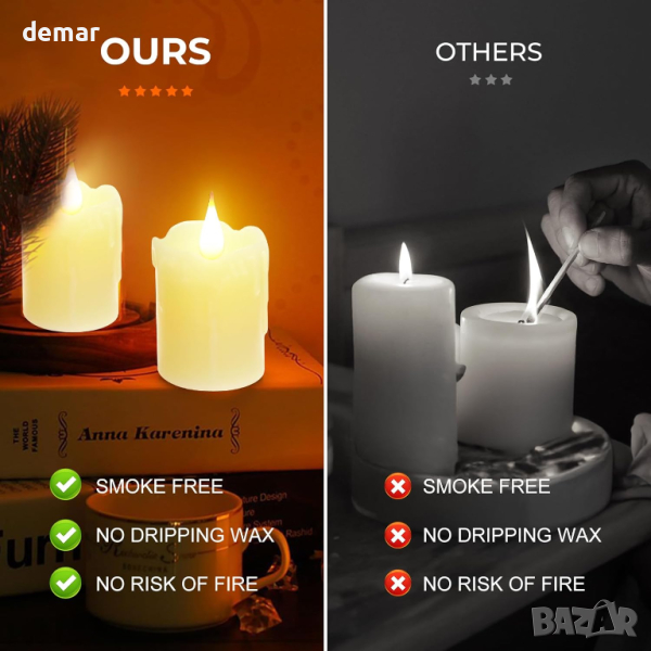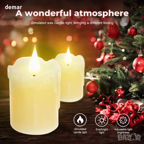 Тези електрически чаени свещи, с размери 2x4 инча, са идеално проектирани да пасват на повечето държачи за оброци, държачи за чаени светлини и осветителни торбички, с бял цвят на слонова кост, идеален за Свети Валентин, романтични вечери, сватби, партита и др. Те могат да се използват както на закрито, така и на открито за различни поводи като празнуване на рождени дни, сватбени тържества, коледна украса на прозорци и Хелоуин. Към тези свещи е включено IR безжично дистанционно управление за лесна работа, включително включване/изключване, регулиране на яркостта и настройка на таймера за 2/4/6/8 часа. Изработени от истински восък с 3D фитил, дизайн със стопени ръбове и трептящ безпламъчен ефект, тези свещи предлагат ярък и реалистичен вид без опасностите от истински пламък. Те идват с акумулаторни батерии и кабел за зареждане, което елиминира нуждата от батерии за еднократна употреба, което ги прави рентабилни и екологични. Пълно зареждане от 1,5 часа позволява над 12 часа използване на ярка светлина. Тези свещи гарантират безопасност и създават топла, реалистична светлина, идеална за домове с домашни любимци или деца, без риск от пожар, неприятни миризми, восъчни миризми или капки.