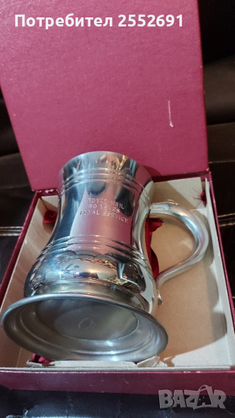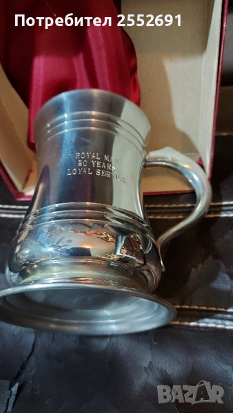 Масивна,метална чаша с дръжка. Наличие на надпис "ROYAL MAIL 20 YEARS LOYAL SERVISE" MADE IN ENGLAND. Височина- 13см.