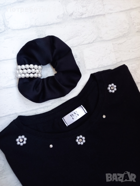 Тениска с перлени маргаритки и скръчи с перли.