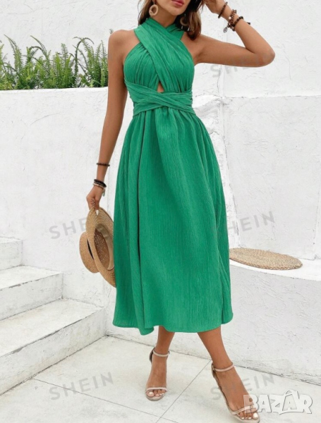 Роклята ми е поръчка от SHEIN, но не се одобрих. Състои се от долна част и две широки дълги ленти плат, които се слагат около тялото по различни начини. Много красива.