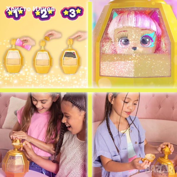 Новите CELEBRIPETS са истински знаменитости! Забавлението с тях започва още с разопаковането им. Използвай диспенсъра, за да извадиш златния шампоан от козметичното шише и да разкриеш скритото вътре кученце. Кученцата са с премиум детайли - истински мигли, стъклени очи, златиста коса и много аксесоари. Открий 10-те изненади, скрити в козметичното шише, и създай великолепни прически със златист блясък! Събери всичките 6 кученца от колекцията! Кое ще ти се падне?