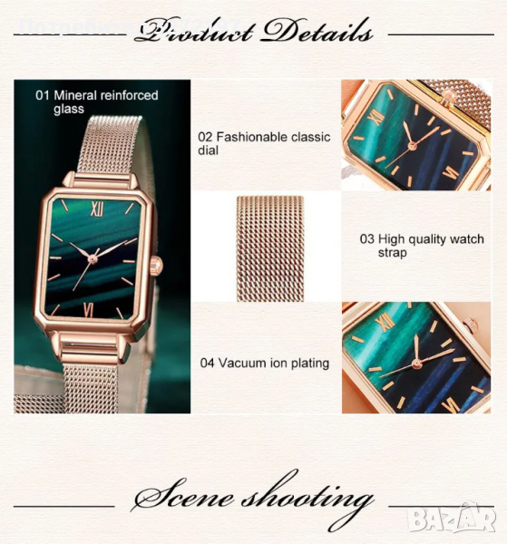 • Квадратна форма на циферблата: Квадратната форма на циферблата на този часовник добавя нотка модерност и изтънченост към всяко облекло.