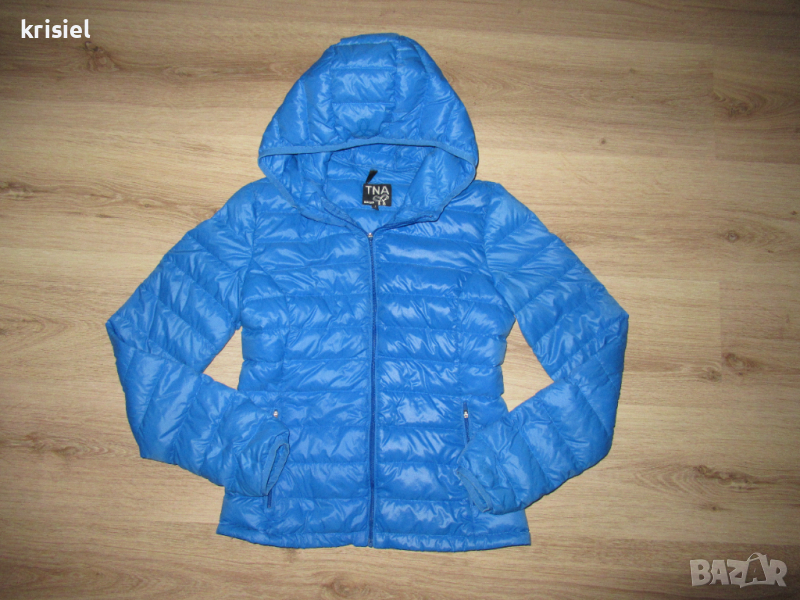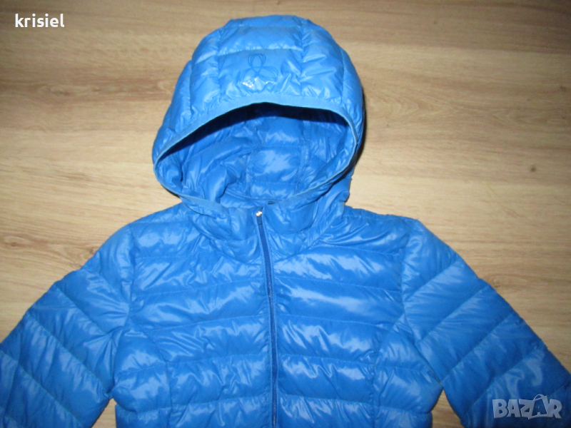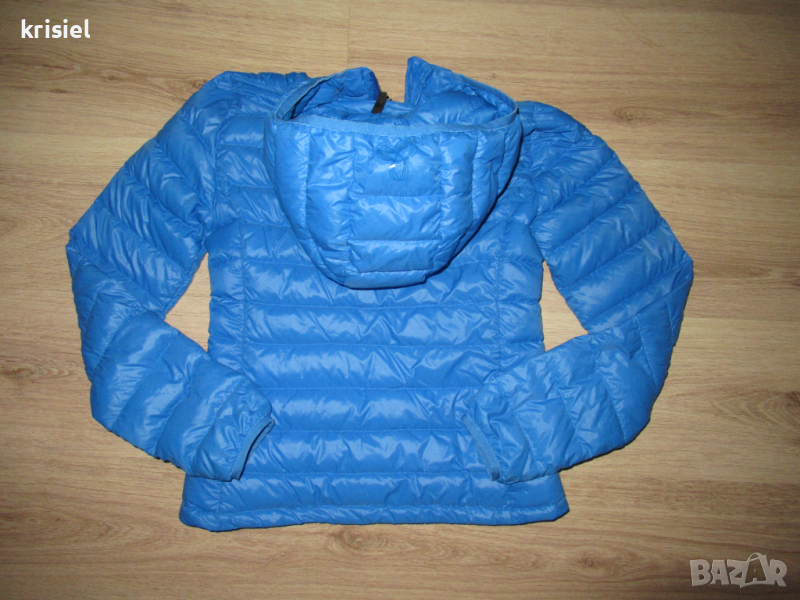 Якето е отлично.Номер XS.Супер олекотен пролетен модел.Вталена красива кройка. С качулка.В страхотен синьо-зелен цвят.Размерите са:дължина-53см,гръдна-43см,талия-37см,ръкав-62/49см