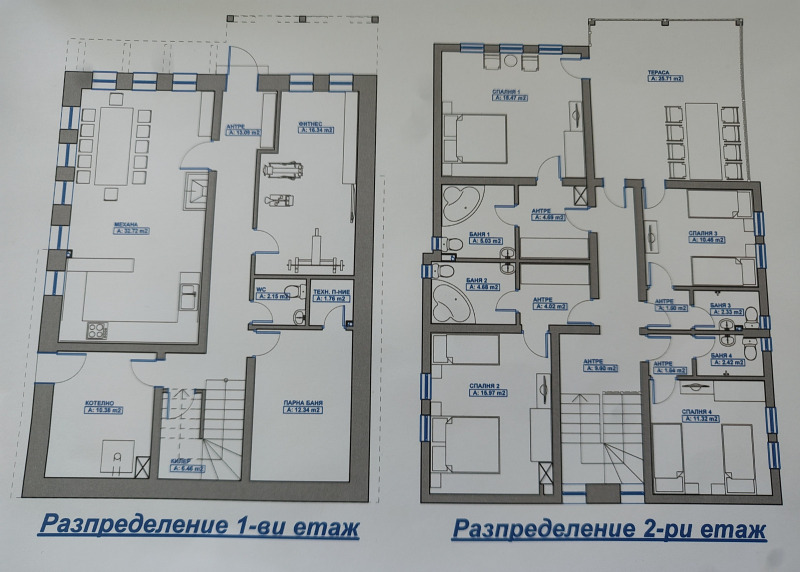 Всяка къща е с РЗП от по 304,5 кв.м., в която площ е включен и 31,5 кв.м. гараж.