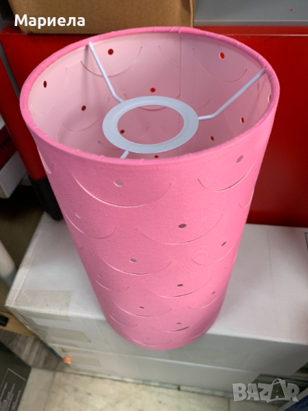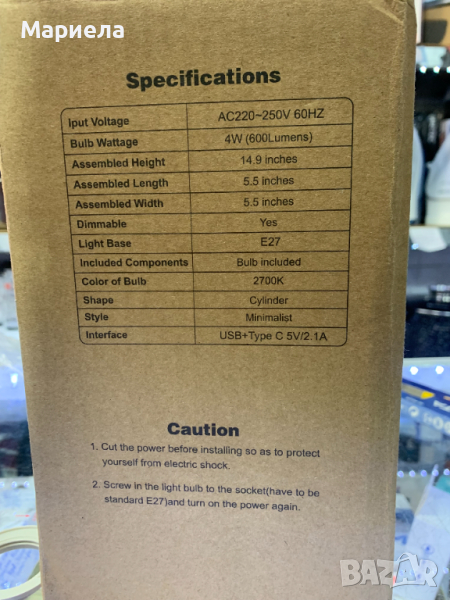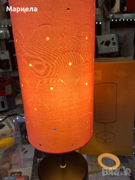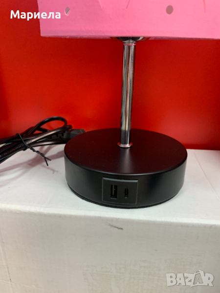 Лампата е закупена от разпродажба в Германия .Размерите са : 38х14 см.Фасунгата е с цокъл Е27 .Лампата има USB за зареждане на телефон или друго Smart устройство .Има тъч за светване на лампата .Към лампата има и крушка за нея .Абажура е текстилен и е лесен за подмяна .