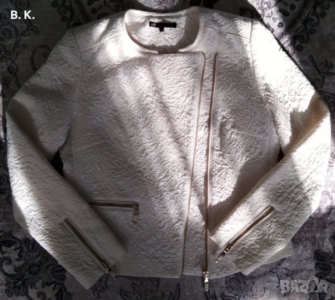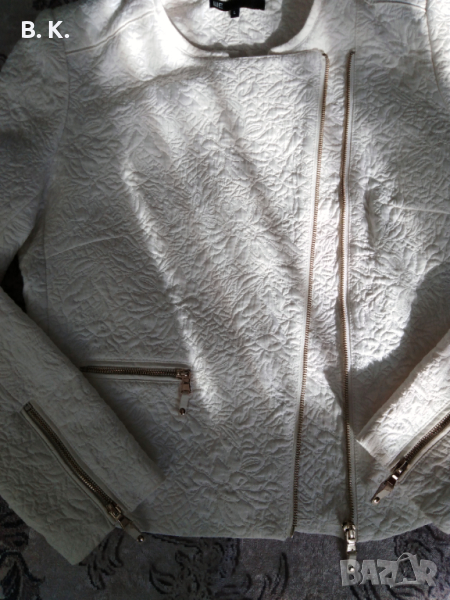 Ново стилно късо яке в бяло с ципове на джобовете и ръкавите от много хубав плат.Елегантно, нежно и красиво.
