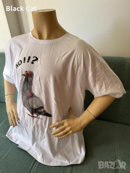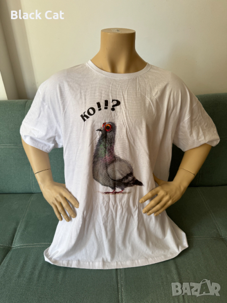 Бяла забавна (майтапчийска) тениска, с картинка (щампа) на ококорен гълъб и надпис: "КО!!?".