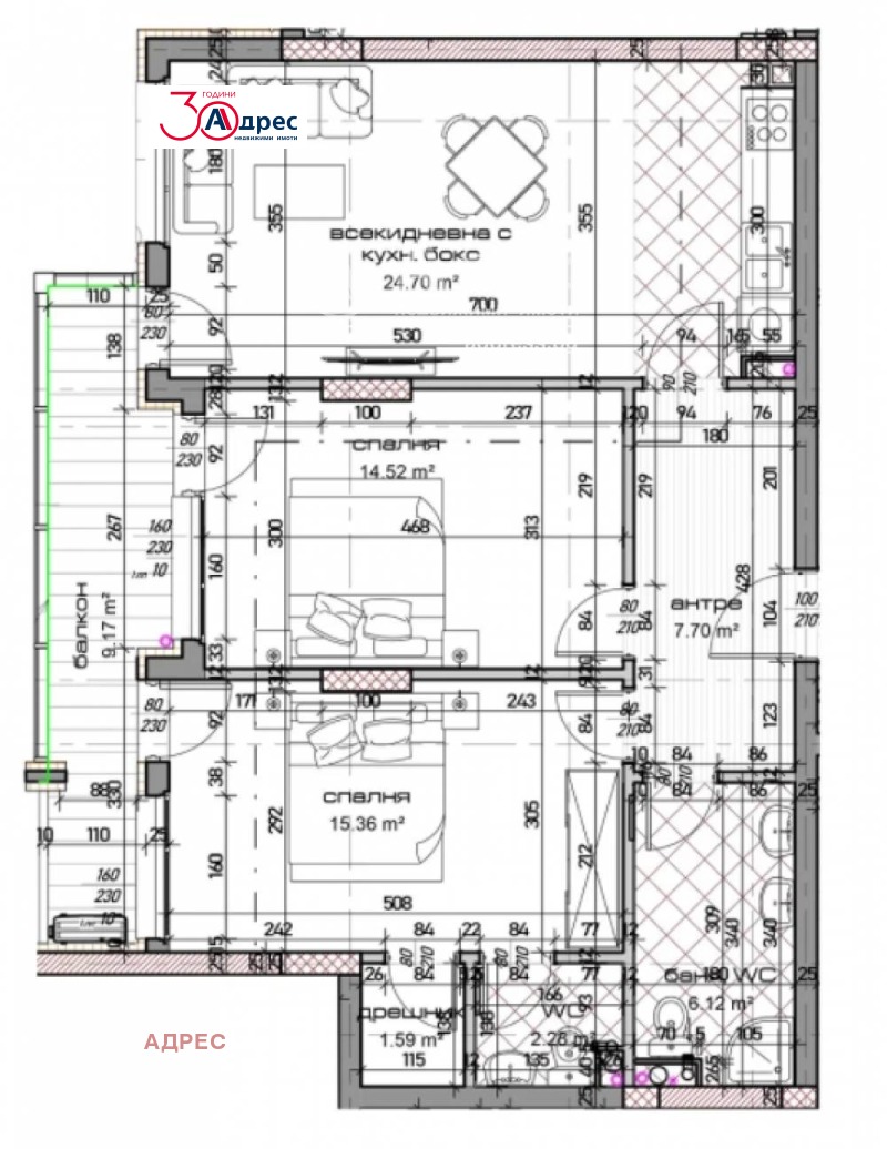 Тристаен апартамент със ЗП- 92,42 кв.м., а с общите части 112,53 кв.м. Разполага с антре, спалня с баня-тоалет и дрешник, спалня, баня с тоалет и балкон