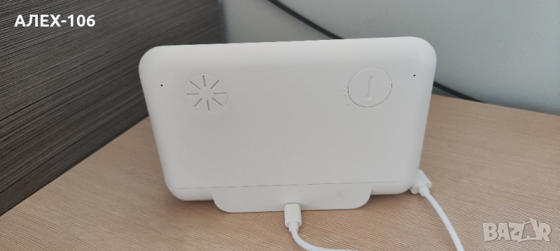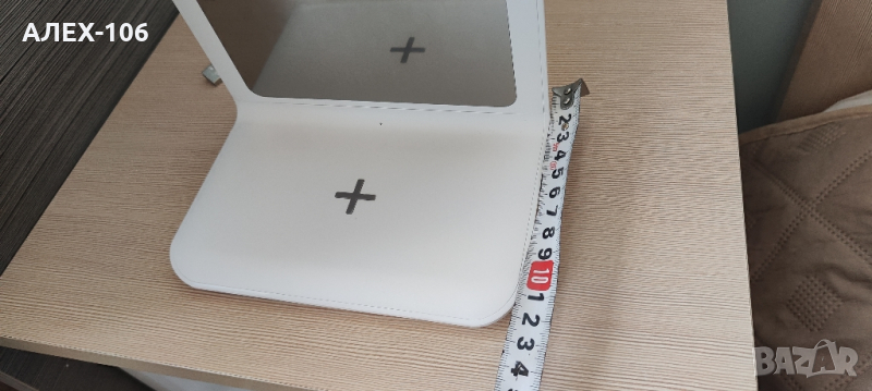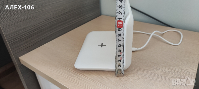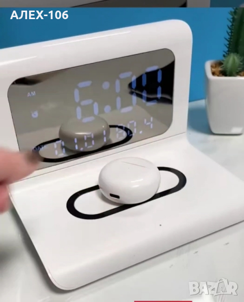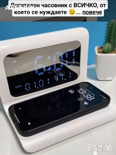 Дигитален часовник и безжичена зарядна. размер: 17см./12см. тази снимки има размер. Чисто нов има да кутия.