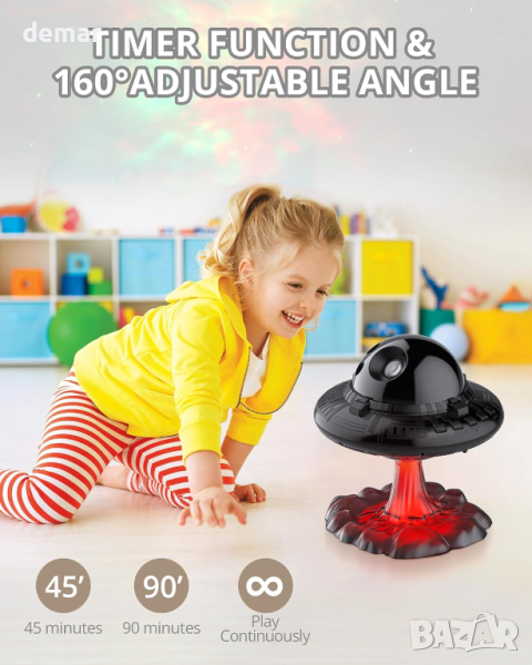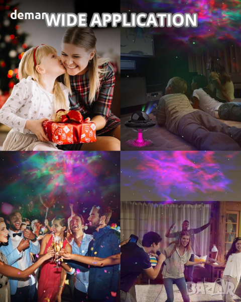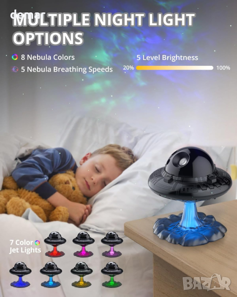 проектор HOMGEN Galaxy Nebula създава с ярки облачни ефекти и динамично излитащо струйно осветление, предлагайки спокойна атмосфера, идеална за всяка стая. Разполага с 8 цвята мъглявина, 3 звездни режима и уникални шарки на космически кораби, с възможност за включване и изключване на шарки поотделно или в комбинации за различни светлинни модели. Проекторът има 5 нива на регулируема яркост и скорост, обслужващи различни дейности от учене до купони. Оборудван с дистанционно управление за лесни настройки и функция за таймер, той позволява персонализиран ъгъл на прожектиране до 160°. Гъвкава и достойна за подарък, тази галактична нощна лампа е идеална за рождени дни, Коледа и тематични партита, подобрявайки всяко пространство като детски стаи, игрални зали, кафенета и барове с успокояващо и ангажиращо светлинно шоу.