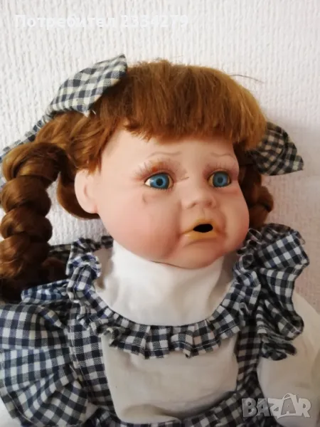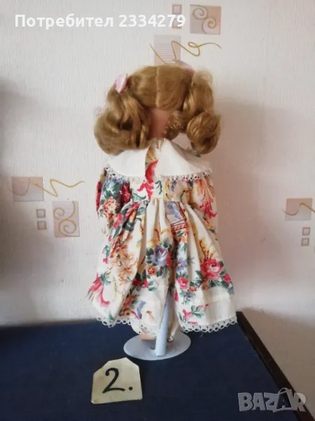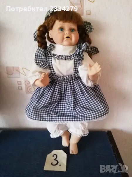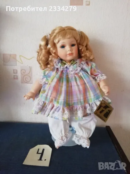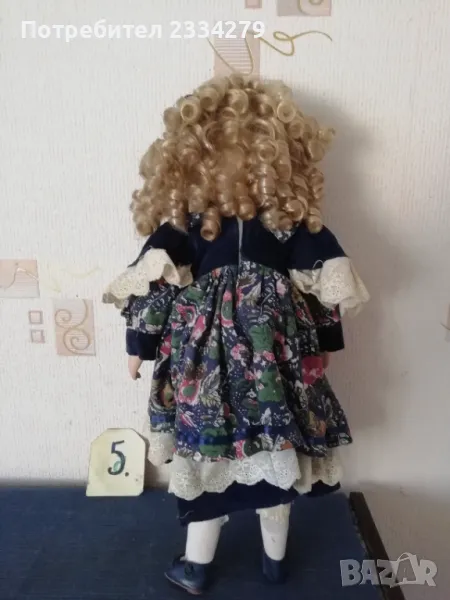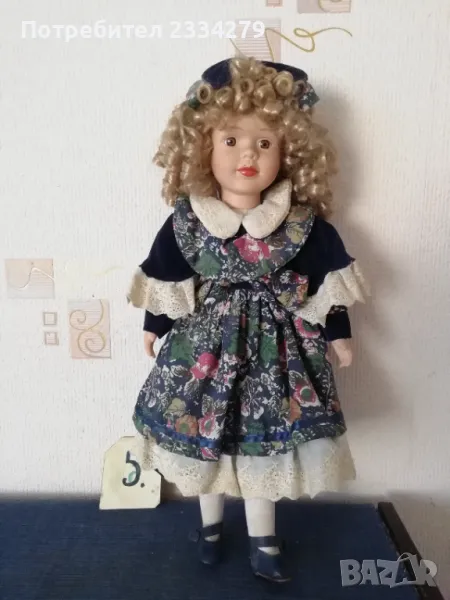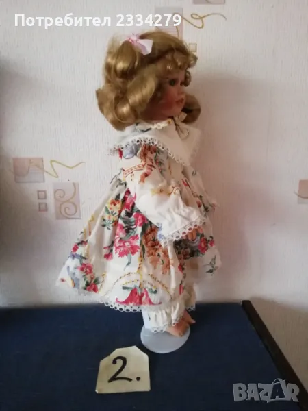 порцеланови кукли, ръчна изработка. N:1 момичето с шапка, стара Баварска изработка, висока 43см., цена 20лв.; N:2 порцеланова красива ръчно изработена маркова кукла, висока 42см., цена 25лв.; N:3 красива масивна порцеланова кукла,,плачещ момиче", лицето има отворена уста, релефни сълзи, цели порцеланови, въртящи се крака може да стои права и седнала, цял ръст 50см., цена 30лв.; N:4 порцеланова маркова кукла на стойка, ръчна авторска изработка, висока 40см., цена 20лв.; N:5 стара порцеланова кукла висока 48см.,маркова,цена 27лв.