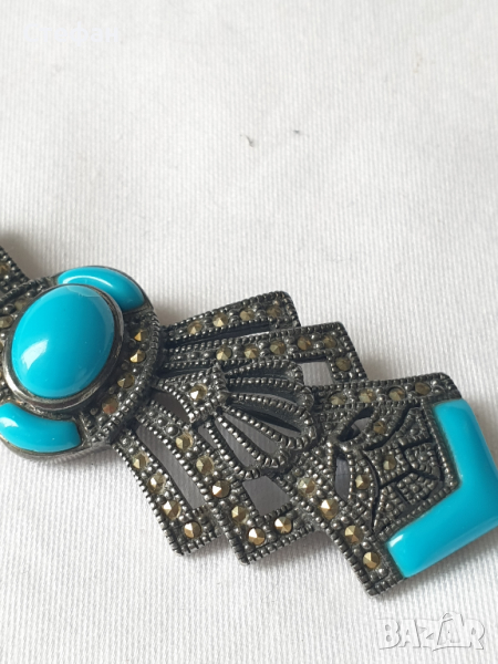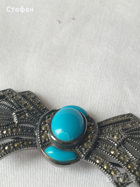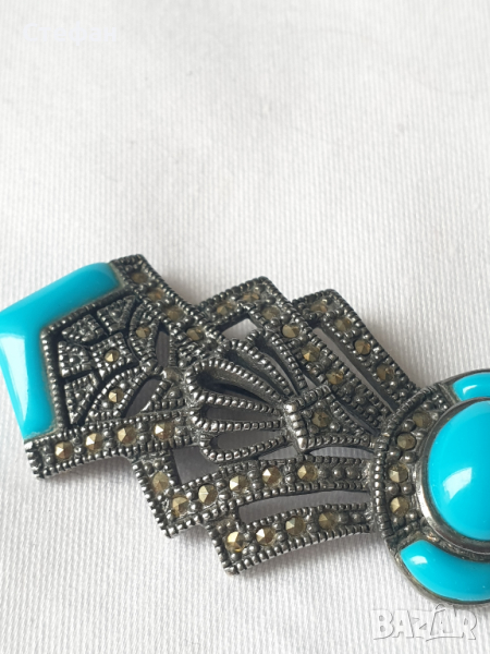Масивна сребърна брошка с естествен тюркоаз и марказити, сребро