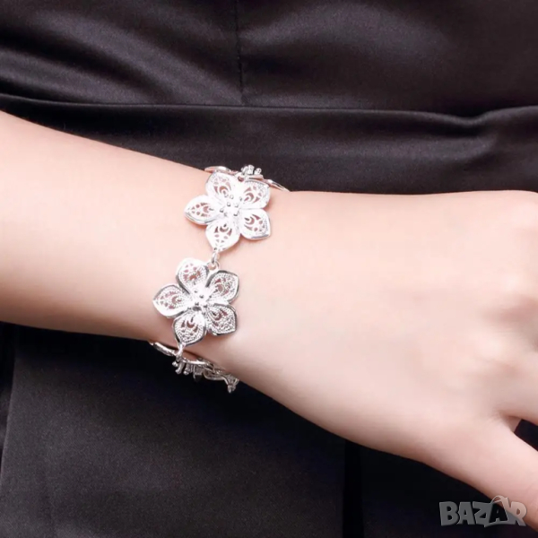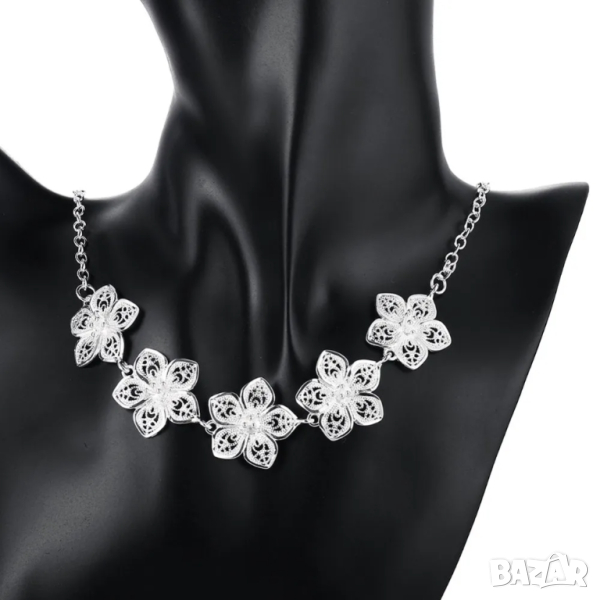 Сребърен комплект цветя състоящ се от гривна с дължина 20см, колие с дължина 50см, и обици.