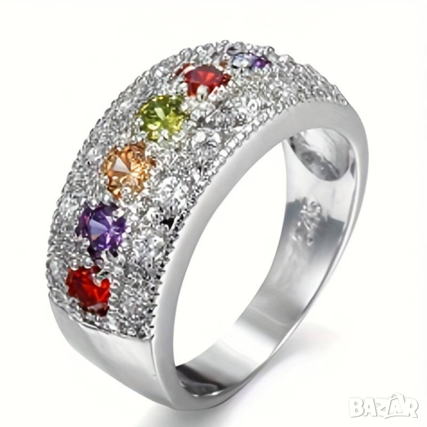 Пръстен от медицинска стомана с искрящи кристали и сапфир, рубин и емералд.