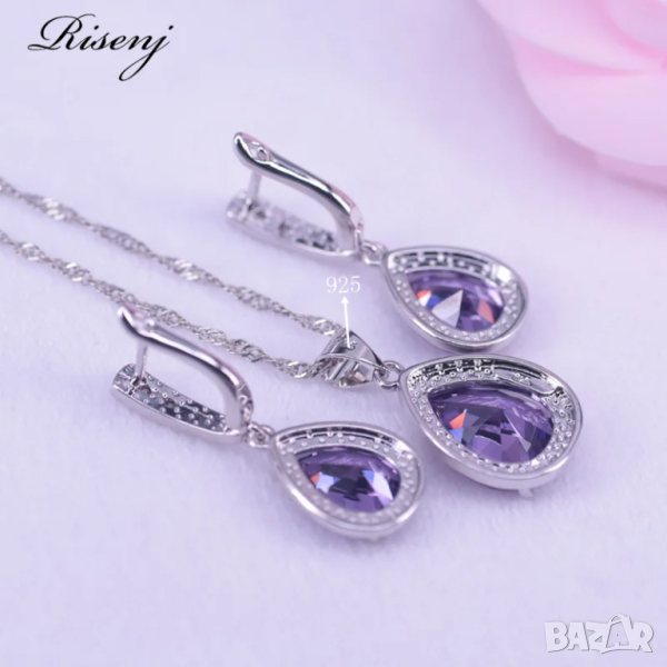 Сребърен комплект състоящ се от пръстен размер 10, колие с дължина 50см и обици, лилав сапфир. цена 24.99 евро