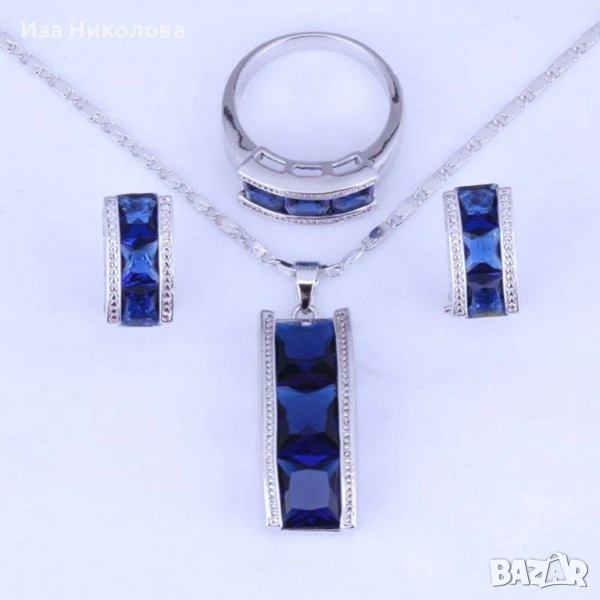 състоящ се от пръстен размер 10, обици и колие със сапфири. цена 24,99 евро