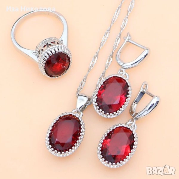 Сребърни комплекти сапфир, рубин - обици, колие и пръстен