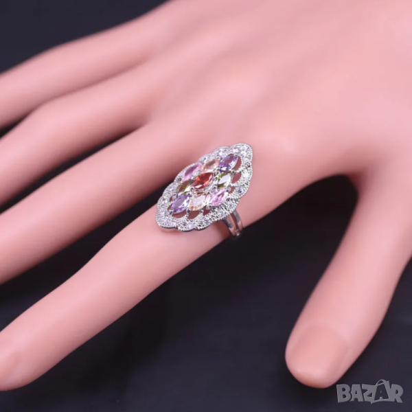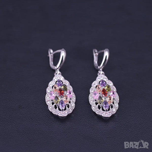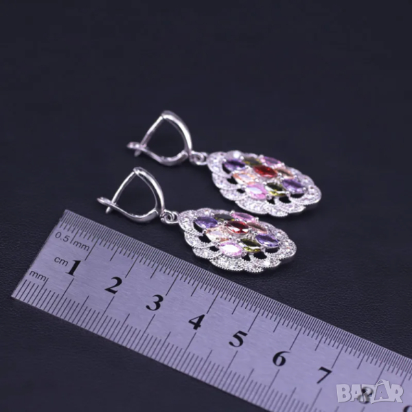 Сребърен комплект със сапфири, рубин, смарагд и искрящи кристали, състоящ се от пръстен с размер 10, колие с дължина 50см и обици, всичко това е подаръчна кутийка.
