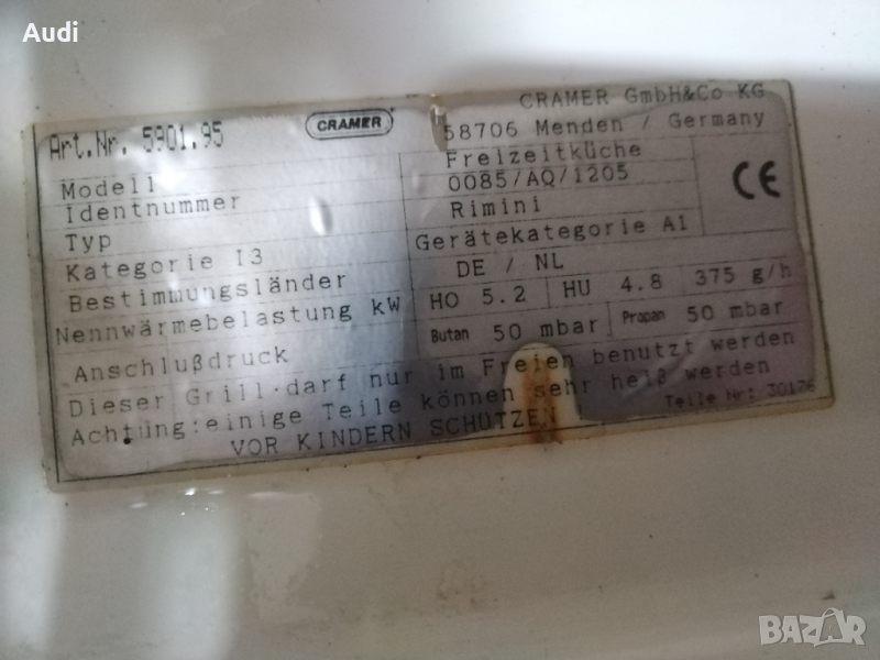 Немско разглобяемо газово барбекю с три горелки. Липсва дюзата. Марка: CRAMER / Germany Консумация