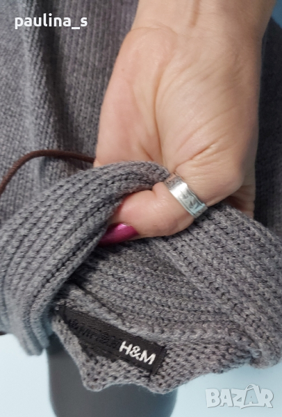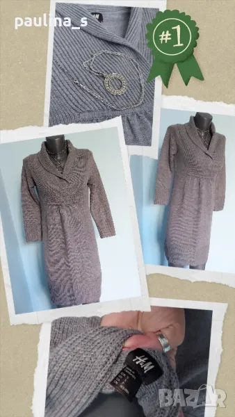1. Колаж / L / 2XL - "H&M". Имам същата и по-малък размер S / L. Цената е крайна 19,99лв. Сезонна рокля тип туника с прихлупващо деколте и шал яка. Ръкавите са 7/8, започват от бието, леко втален силует, мека и приятна за допир акрилена прежда. Има еластичност и покрива няколко размера, посочени са. Без дефекти е, една бройка.